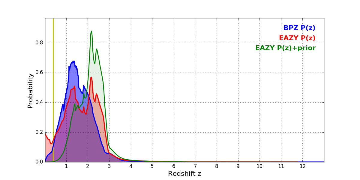 In P(z) plots: Yellow lines mark the cluster redshift z = 0.390,