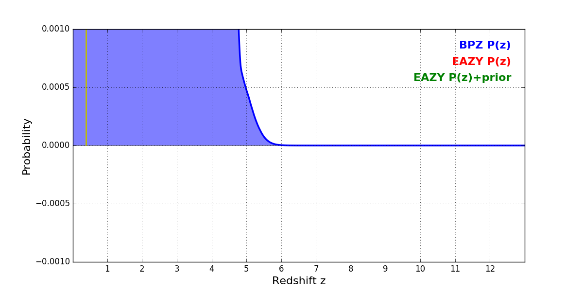 In P(z) plots: Yellow lines mark the cluster redshift z = 0.390,