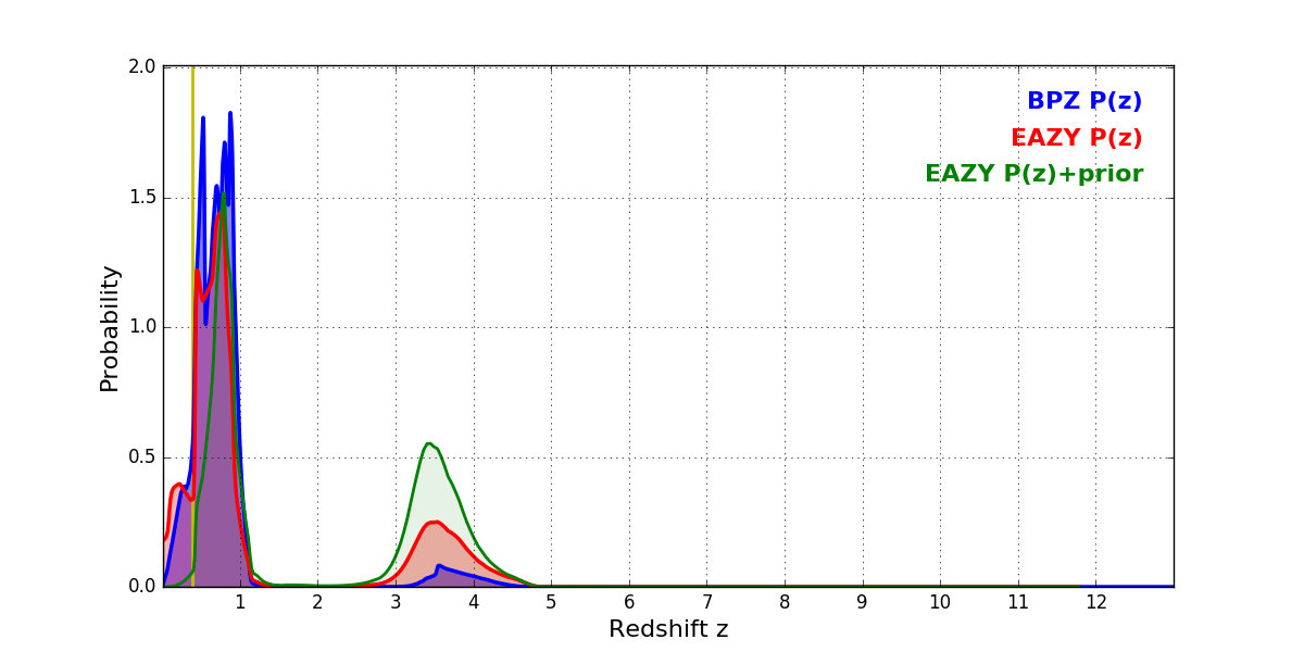 In P(z) plots: Yellow lines mark the cluster redshift z = 0.390,