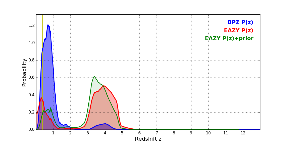 In P(z) plots: Yellow lines mark the cluster redshift z = 0.390,