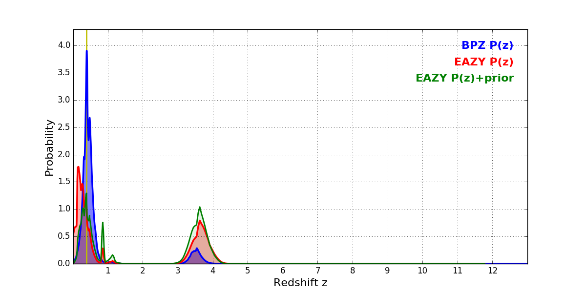 In P(z) plots: Yellow lines mark the cluster redshift z = 0.390,