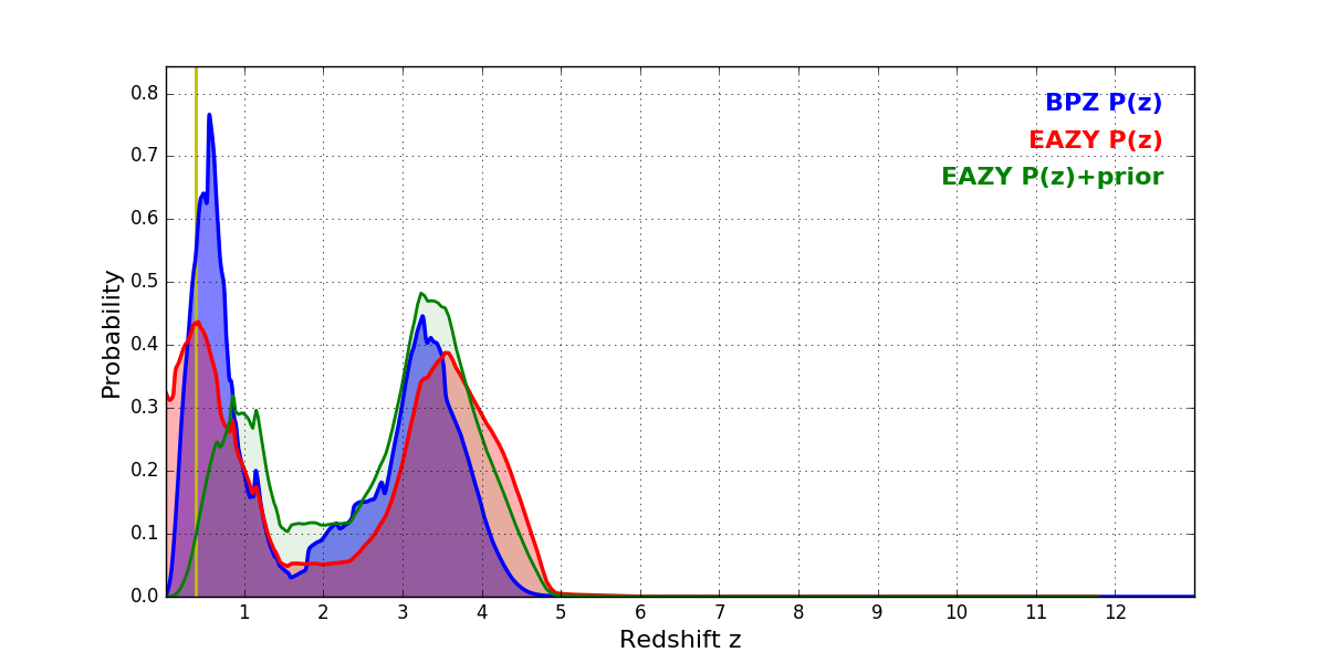 In P(z) plots: Yellow lines mark the cluster redshift z = 0.390,