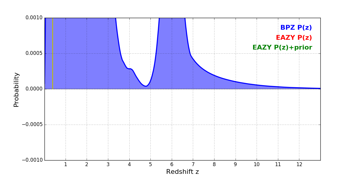 In P(z) plots: Yellow lines mark the cluster redshift z = 0.390,