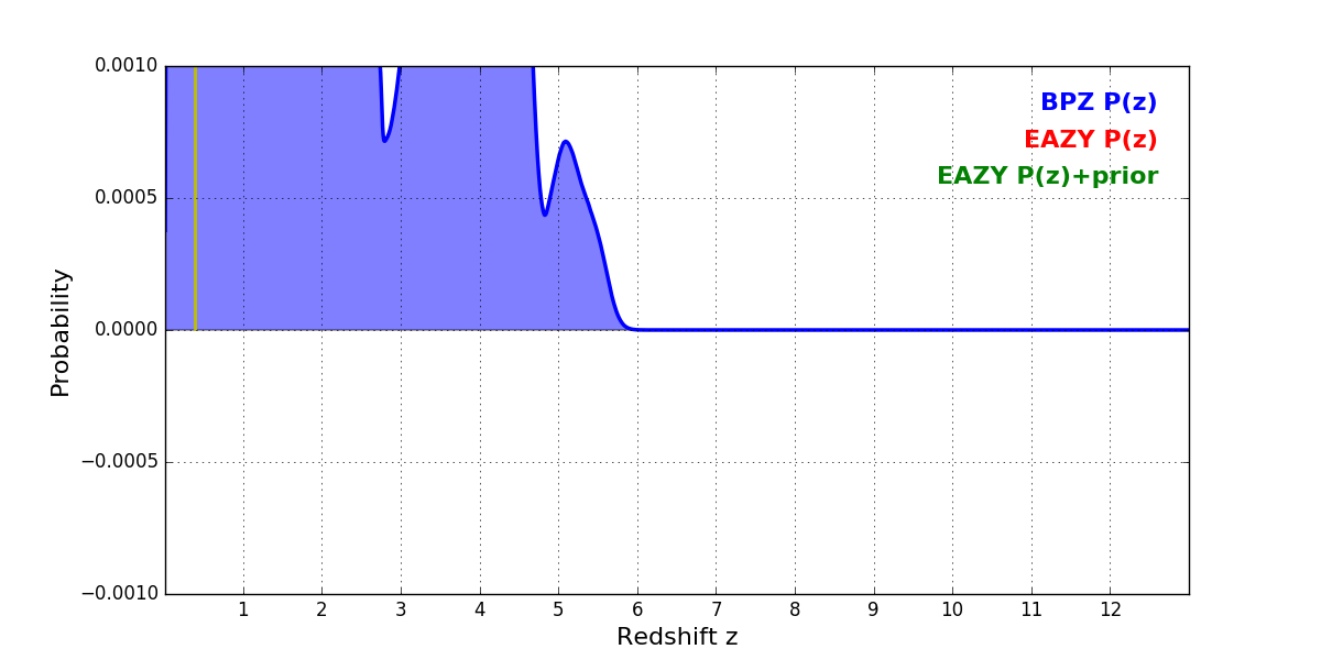 In P(z) plots: Yellow lines mark the cluster redshift z = 0.390,