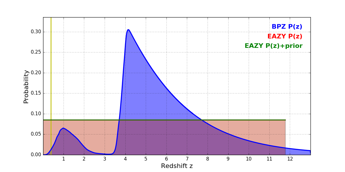 In P(z) plots: Yellow lines mark the cluster redshift z = 0.390,