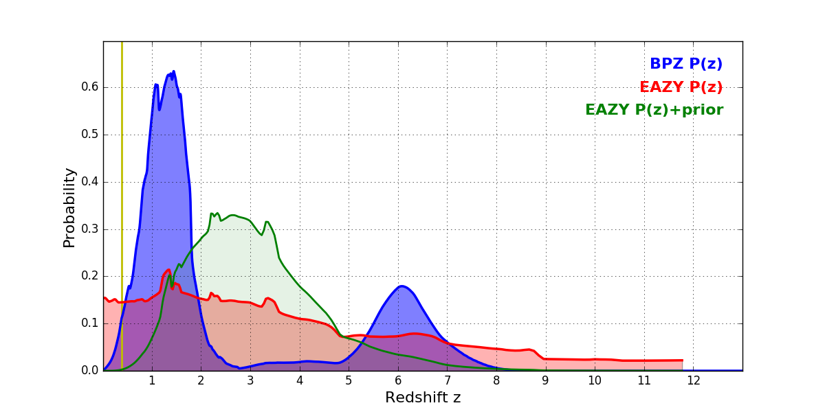 In P(z) plots: Yellow lines mark the cluster redshift z = 0.390,