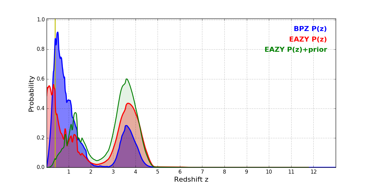 In P(z) plots: Yellow lines mark the cluster redshift z = 0.390,