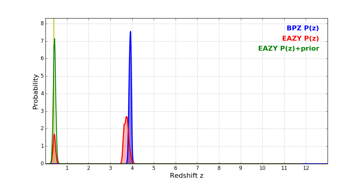 In P(z) plots: Yellow lines mark the cluster redshift z = 0.390,