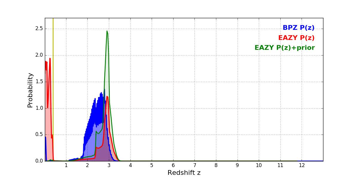 In P(z) plots: Yellow lines mark the cluster redshift z = 0.390,