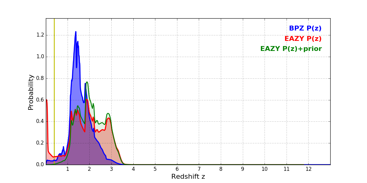 In P(z) plots: Yellow lines mark the cluster redshift z = 0.390,