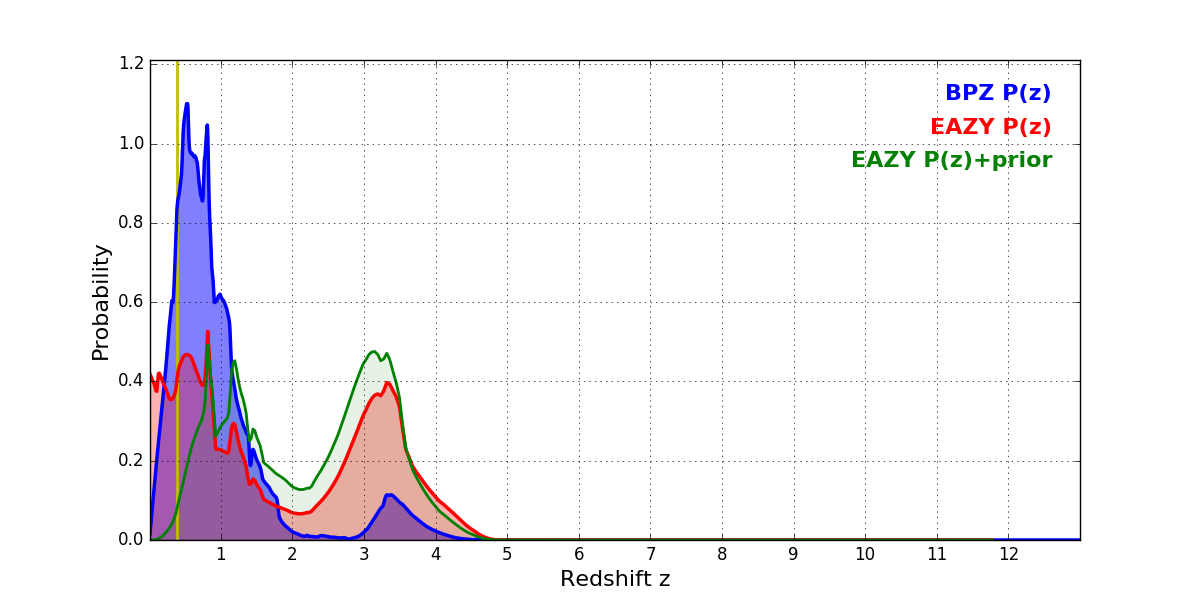 In P(z) plots: Yellow lines mark the cluster redshift z = 0.390,
