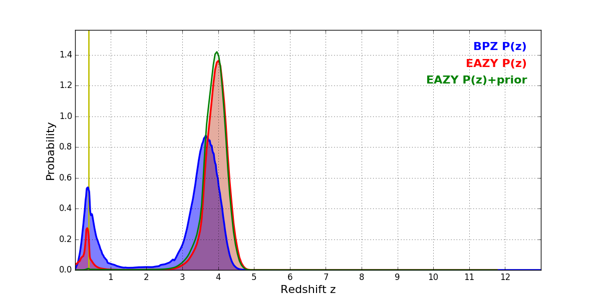 In P(z) plots: Yellow lines mark the cluster redshift z = 0.390,