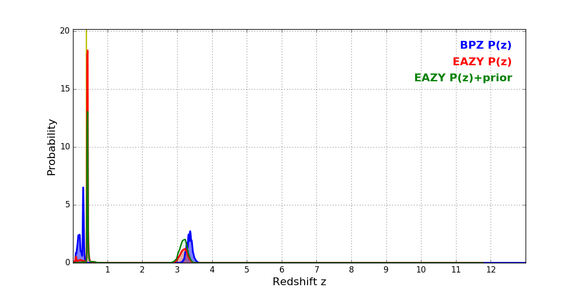 In P(z) plots: Yellow lines mark the cluster redshift z = 0.390,