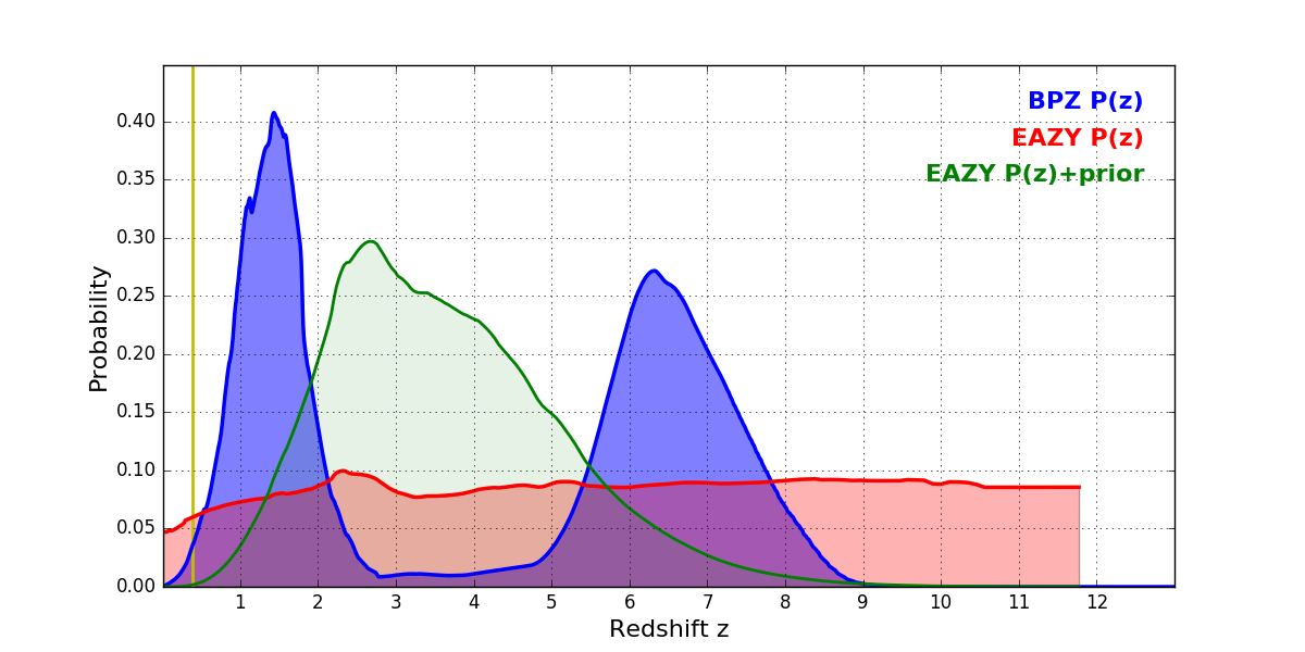In P(z) plots: Yellow lines mark the cluster redshift z = 0.390,