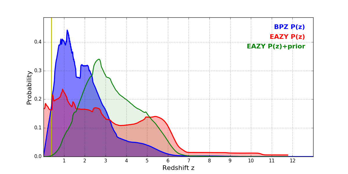 In P(z) plots: Yellow lines mark the cluster redshift z = 0.390,
