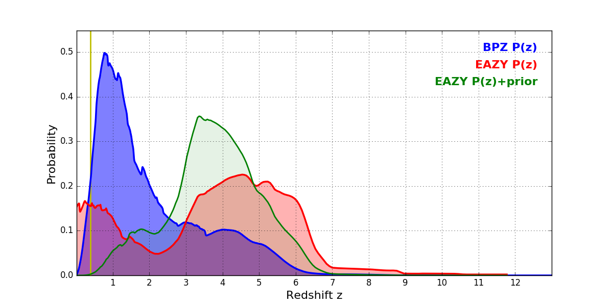 In P(z) plots: Yellow lines mark the cluster redshift z = 0.390,
