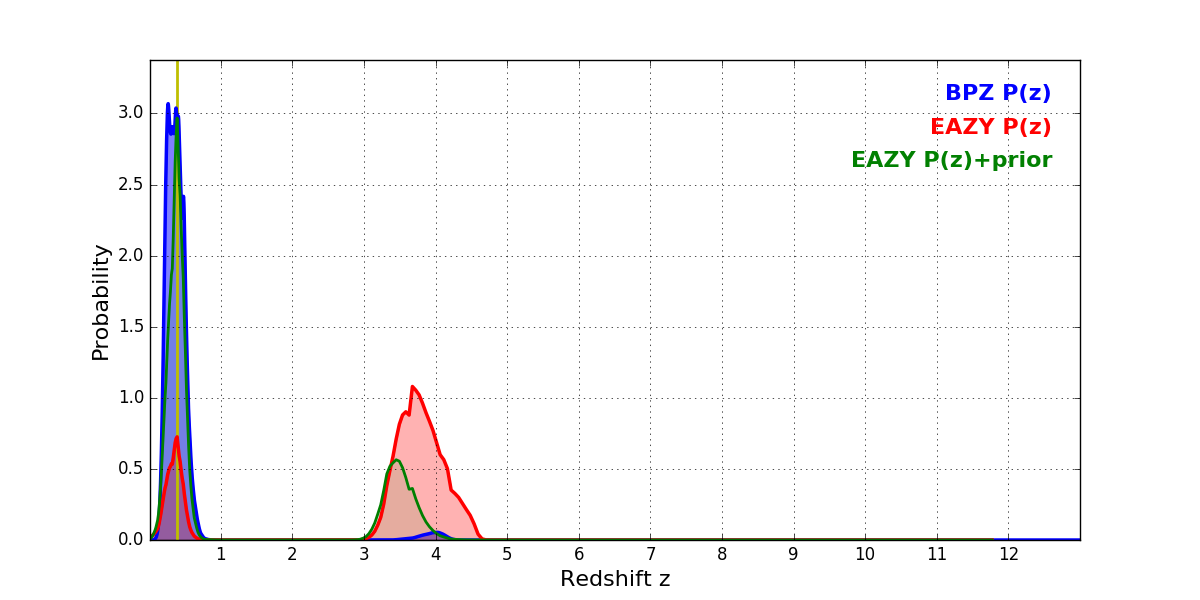 In P(z) plots: Yellow lines mark the cluster redshift z = 0.390,