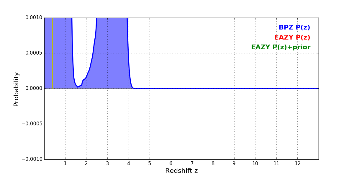 In P(z) plots: Yellow lines mark the cluster redshift z = 0.390,