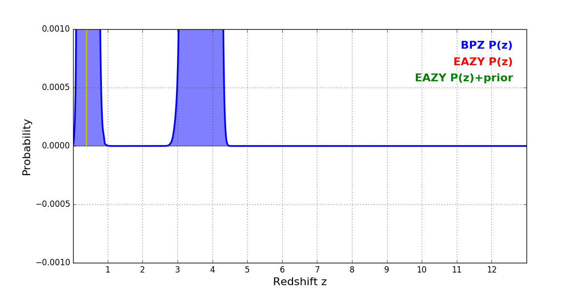 In P(z) plots: Yellow lines mark the cluster redshift z = 0.390,