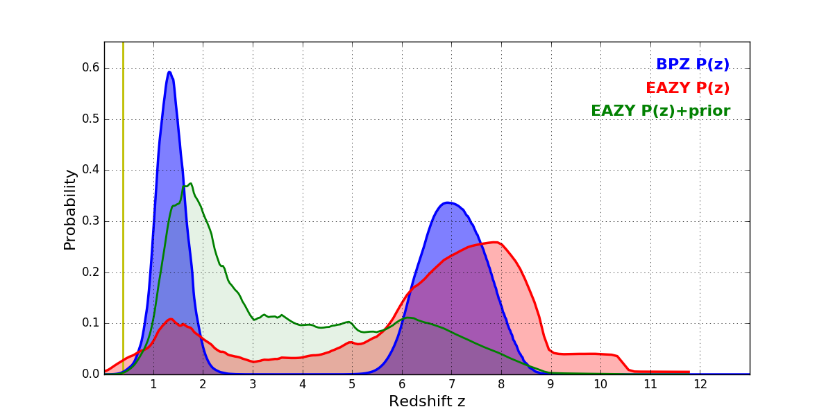 In P(z) plots: Yellow lines mark the cluster redshift z = 0.390,