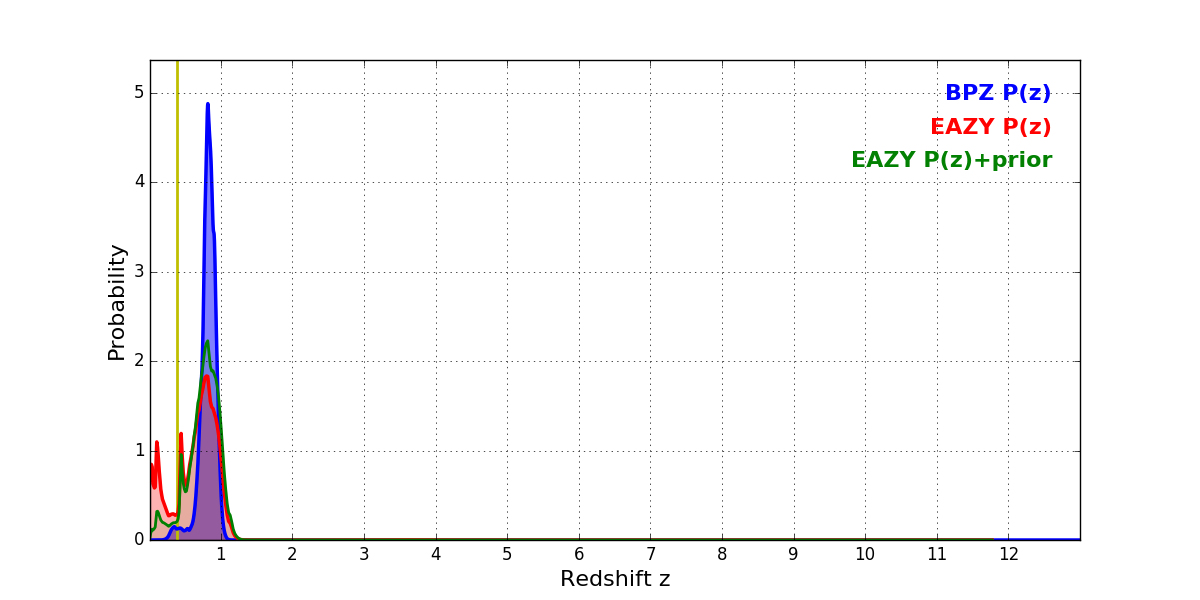 In P(z) plots: Yellow lines mark the cluster redshift z = 0.390,
