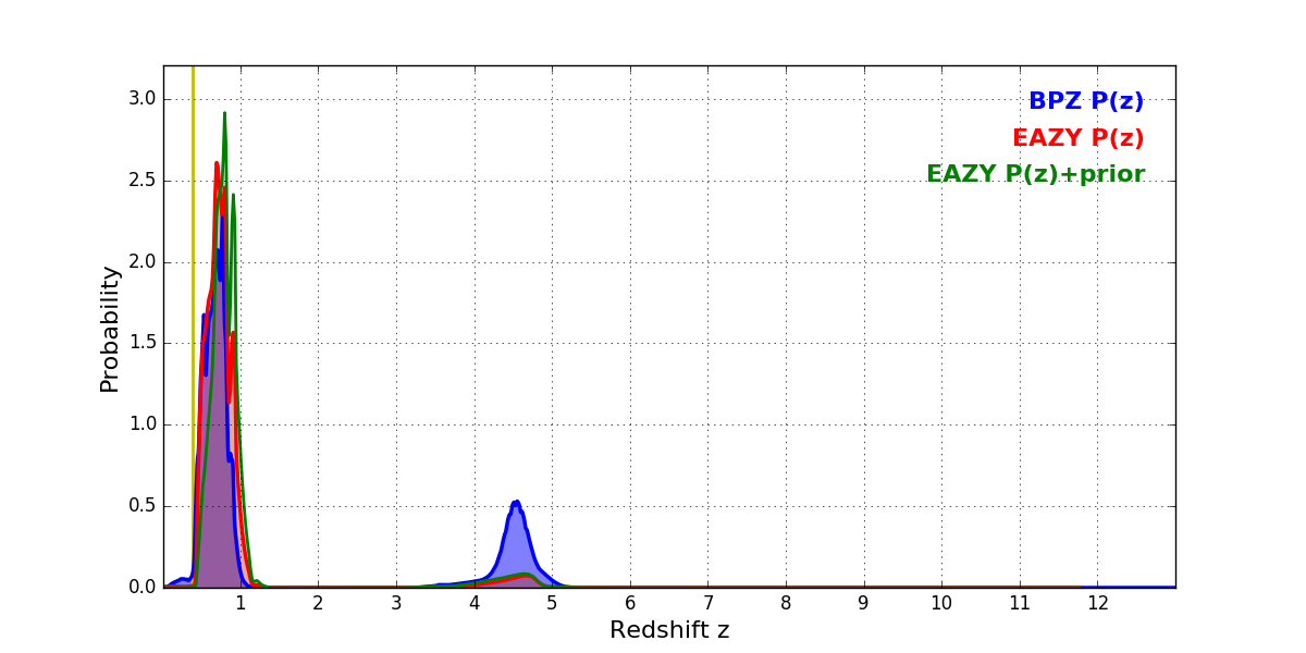 In P(z) plots: Yellow lines mark the cluster redshift z = 0.390,