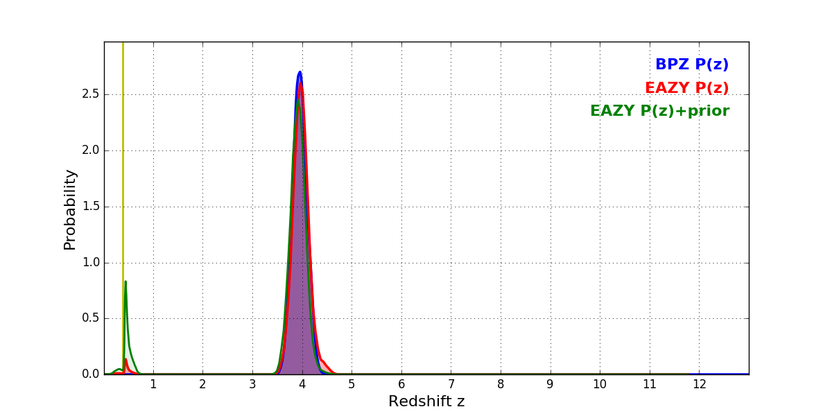 In P(z) plots: Yellow lines mark the cluster redshift z = 0.390,