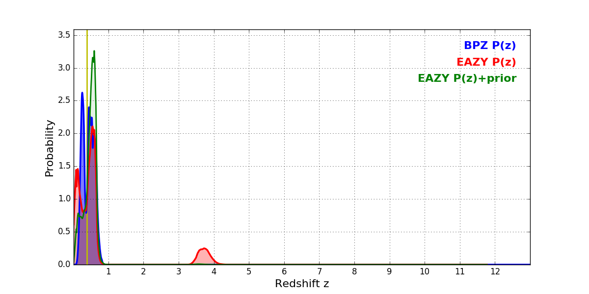 In P(z) plots: Yellow lines mark the cluster redshift z = 0.390,