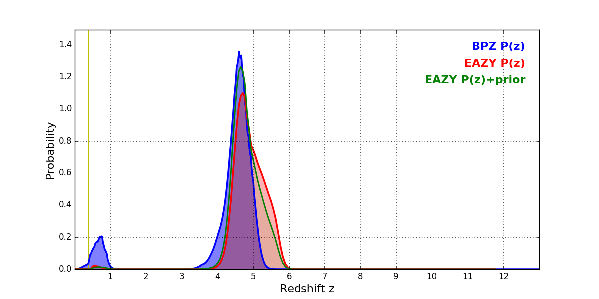 In P(z) plots: Yellow lines mark the cluster redshift z = 0.390,