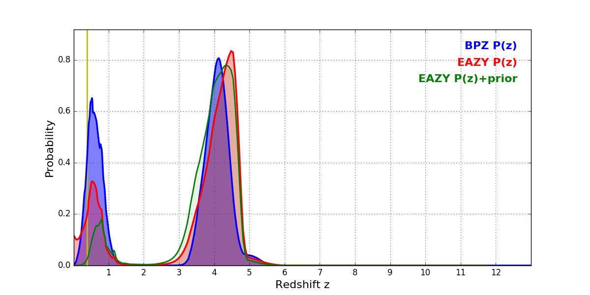In P(z) plots: Yellow lines mark the cluster redshift z = 0.390,