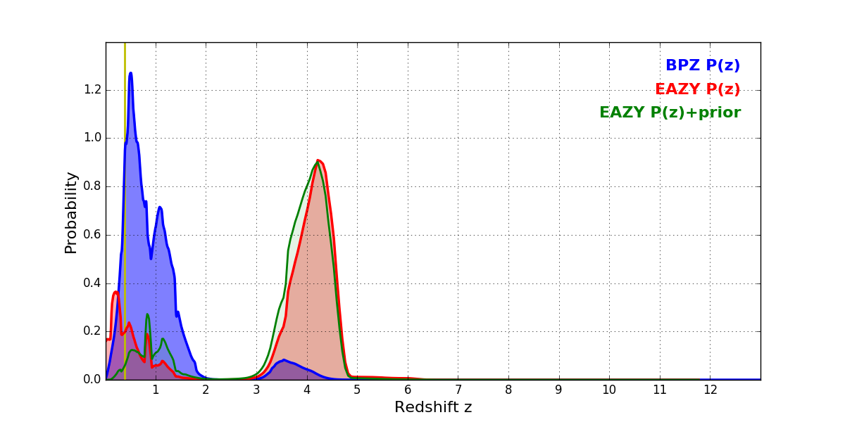 In P(z) plots: Yellow lines mark the cluster redshift z = 0.390,