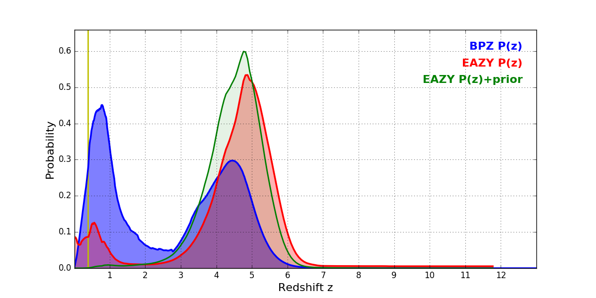 In P(z) plots: Yellow lines mark the cluster redshift z = 0.390,