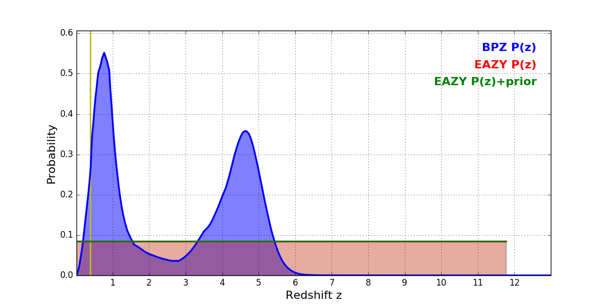 In P(z) plots: Yellow lines mark the cluster redshift z = 0.390,