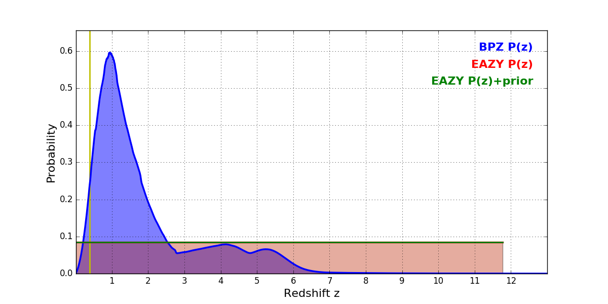 In P(z) plots: Yellow lines mark the cluster redshift z = 0.390,