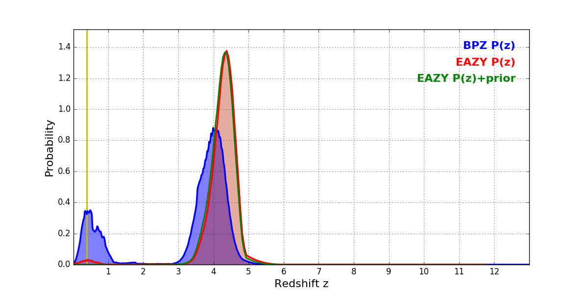 In P(z) plots: Yellow lines mark the cluster redshift z = 0.390,