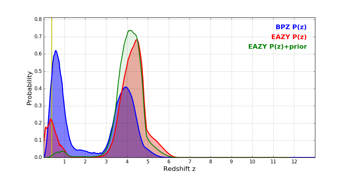 In P(z) plots: Yellow lines mark the cluster redshift z = 0.390,