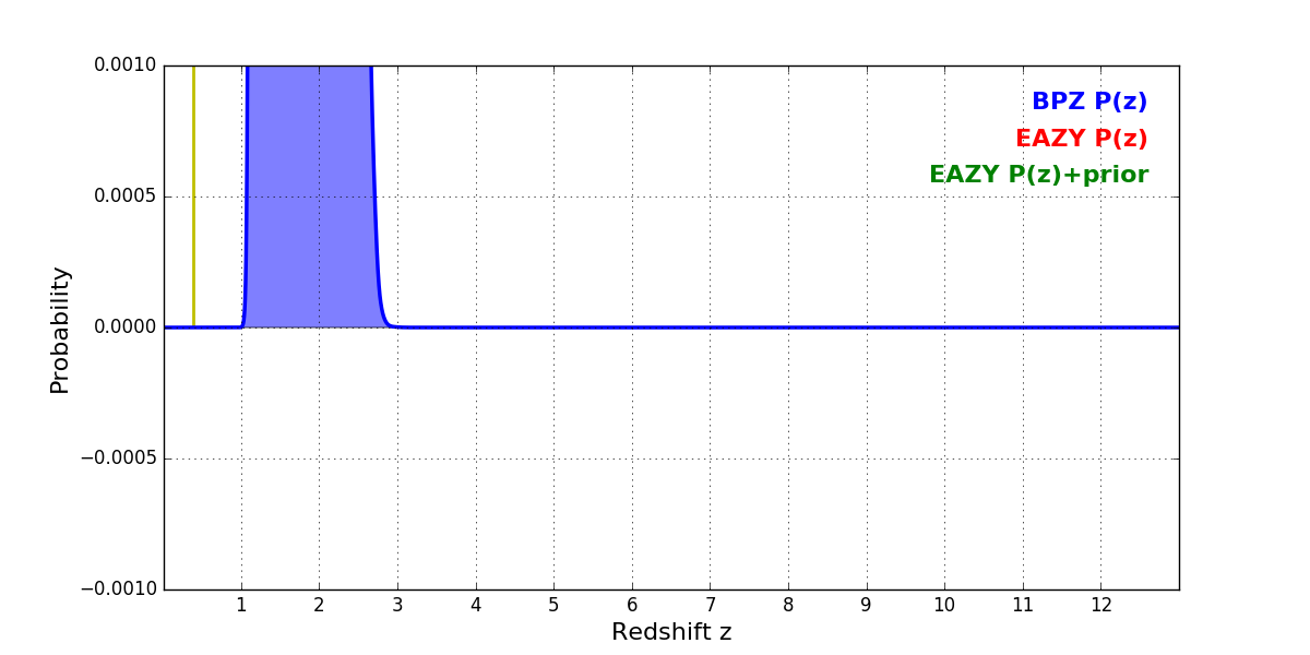 In P(z) plots: Yellow lines mark the cluster redshift z = 0.390,