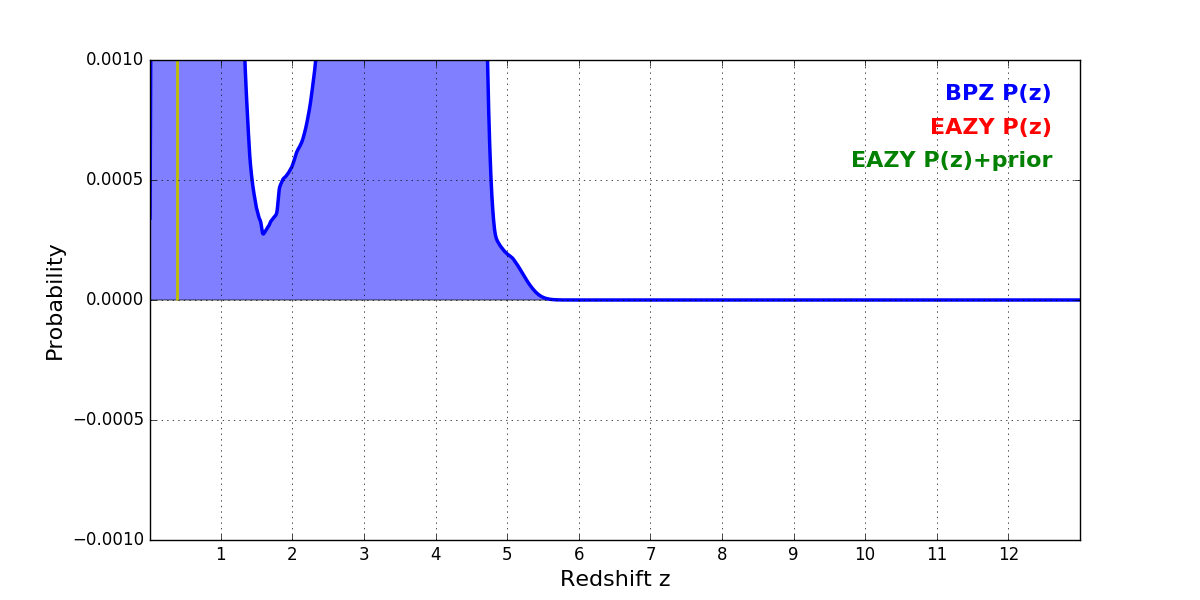 In P(z) plots: Yellow lines mark the cluster redshift z = 0.390,