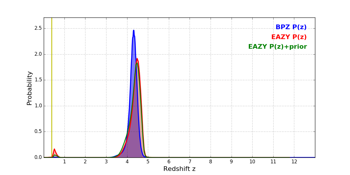 In P(z) plots: Yellow lines mark the cluster redshift z = 0.390,