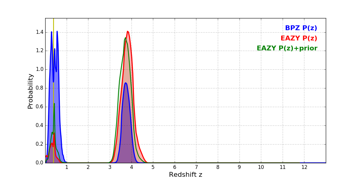 In P(z) plots: Yellow lines mark the cluster redshift z = 0.390,