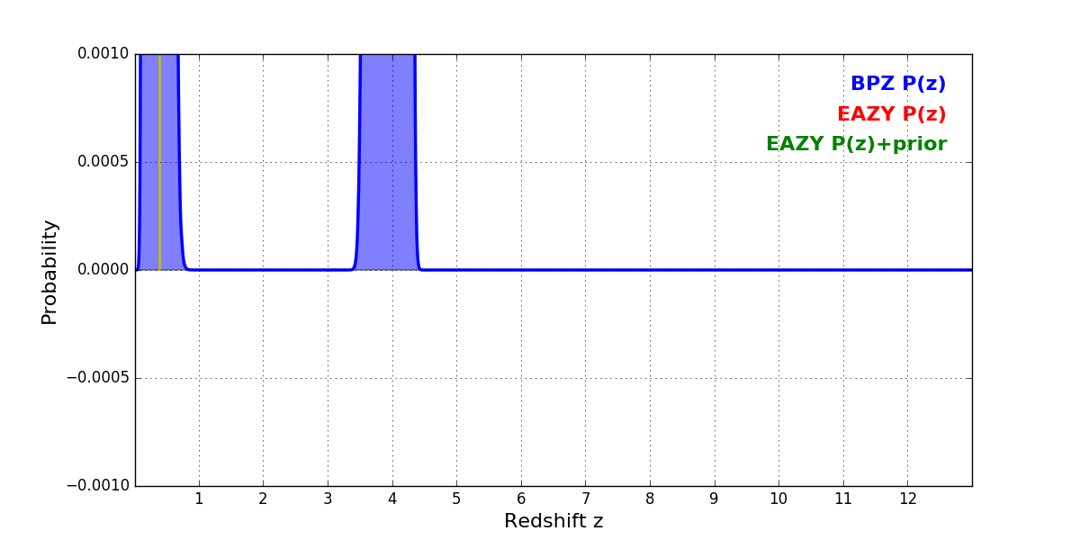 In P(z) plots: Yellow lines mark the cluster redshift z = 0.390,