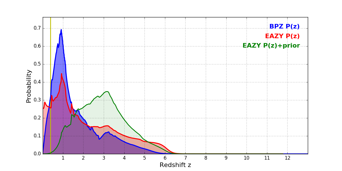 In P(z) plots: Yellow lines mark the cluster redshift z = 0.390,