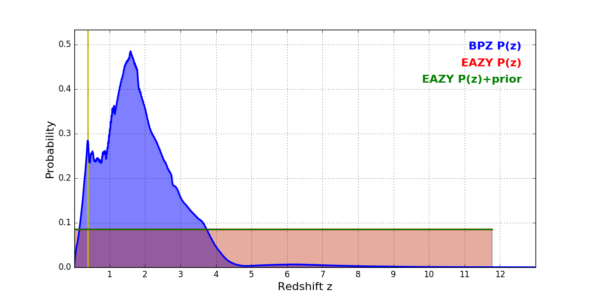 In P(z) plots: Yellow lines mark the cluster redshift z = 0.390,