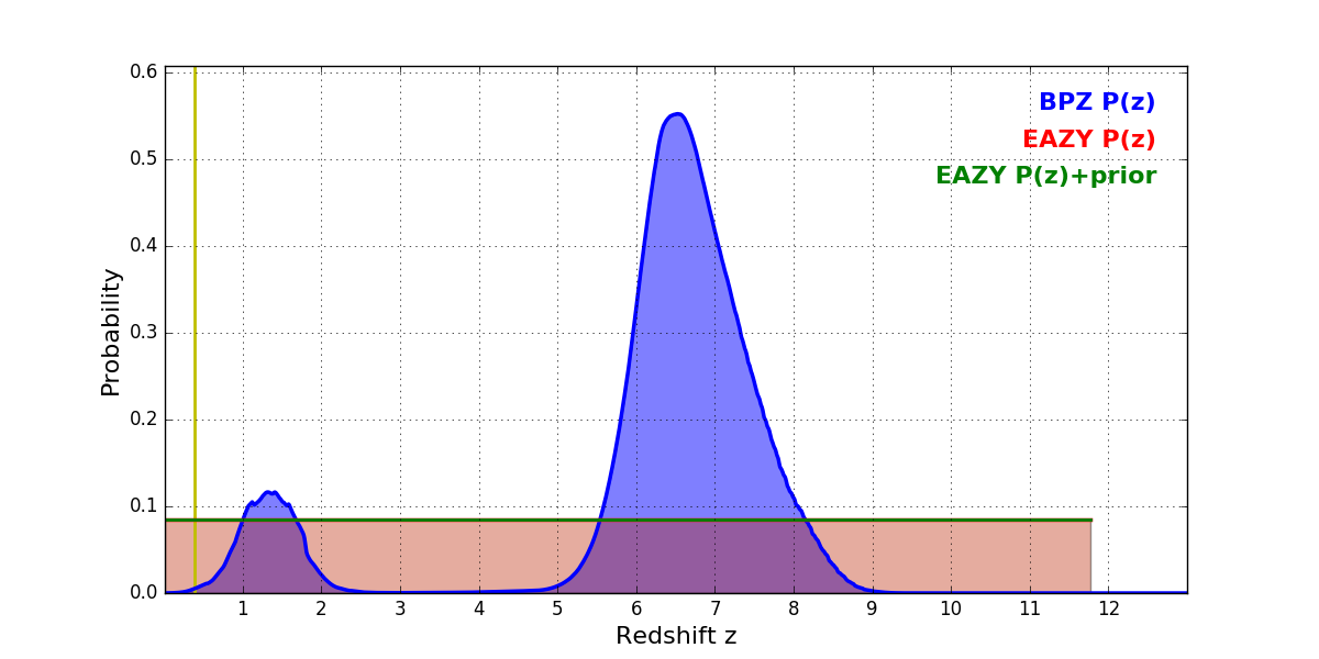 In P(z) plots: Yellow lines mark the cluster redshift z = 0.390,