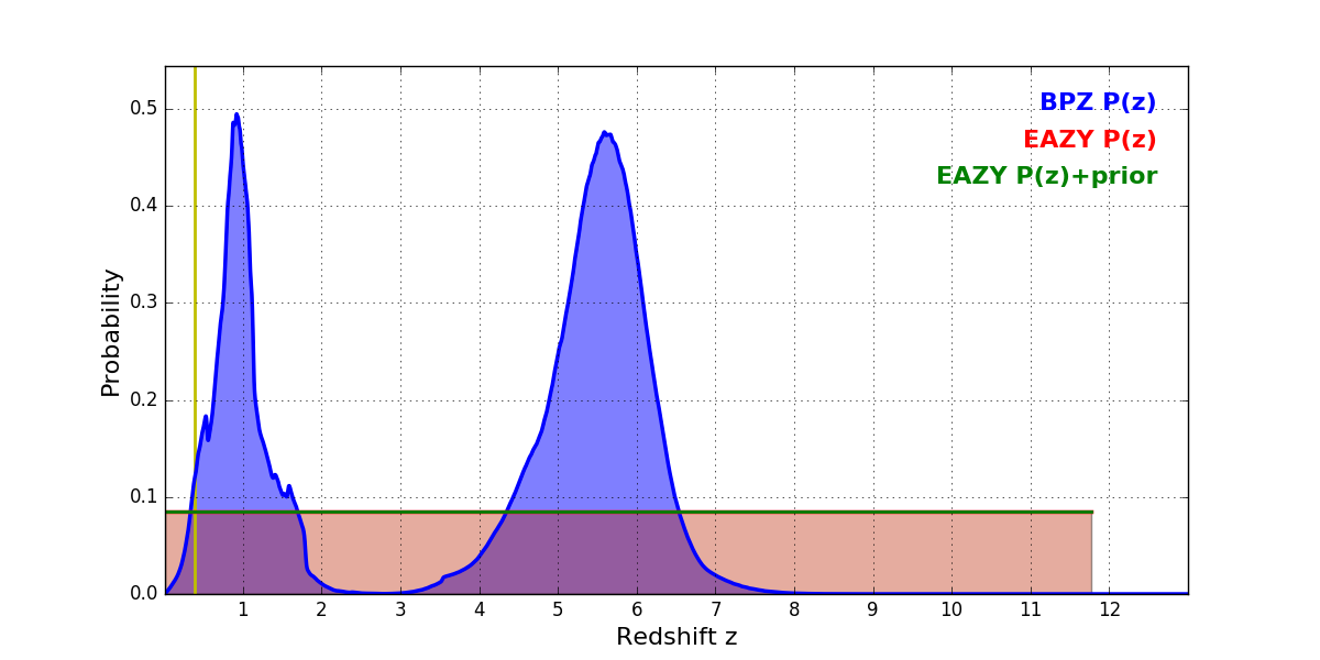 In P(z) plots: Yellow lines mark the cluster redshift z = 0.390,