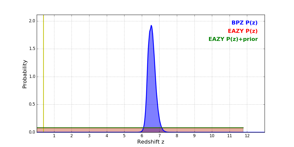 In P(z) plots: Yellow lines mark the cluster redshift z = 0.390,
