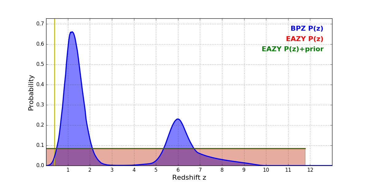 In P(z) plots: Yellow lines mark the cluster redshift z = 0.390,