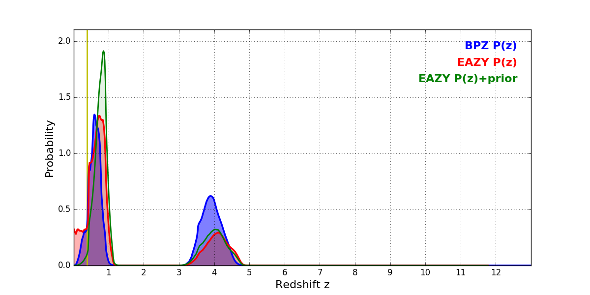 In P(z) plots: Yellow lines mark the cluster redshift z = 0.390,