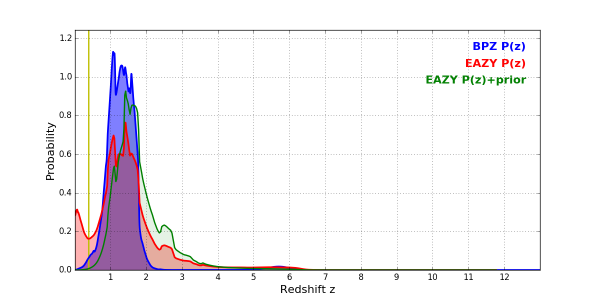 In P(z) plots: Yellow lines mark the cluster redshift z = 0.390,