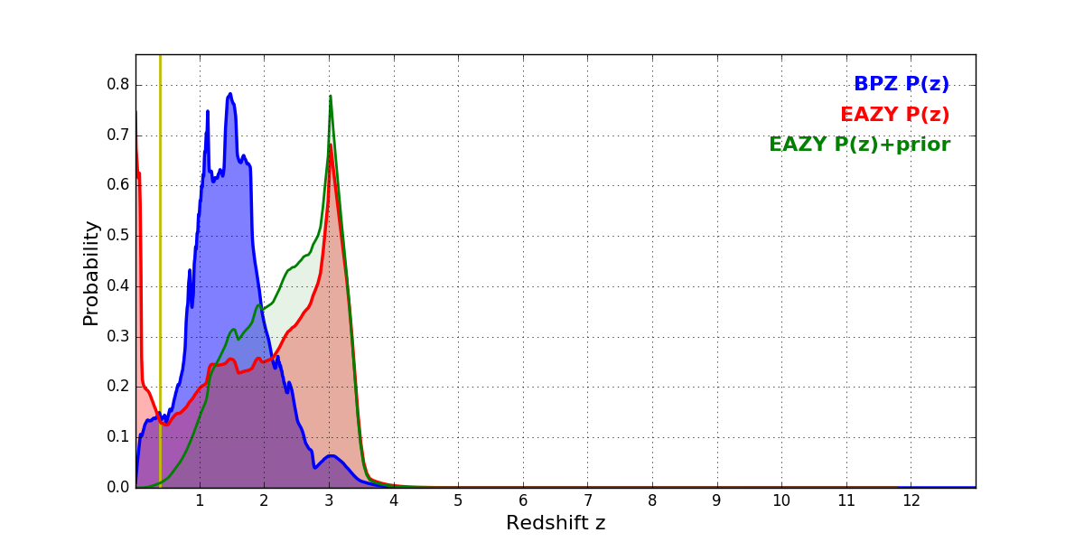 In P(z) plots: Yellow lines mark the cluster redshift z = 0.390,
